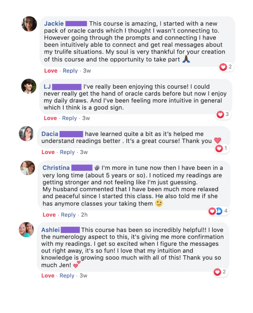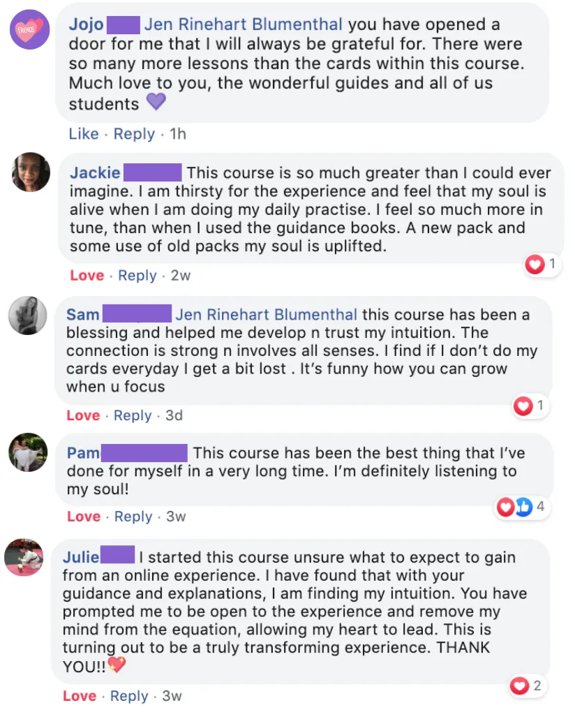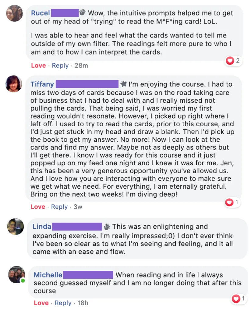 “I am enjoying this course and although I've been using cards for years it is so helpful to be able to be able to read them more intuitively. This is what I've been looking for to further my energy/light work... thank you Jen!”
